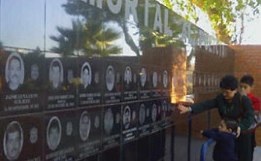 (Photo: Tijuana has dedicated a memorial wall to fallen officers. Amy Isackson/KPBS. )