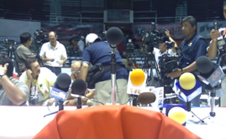 ( Photo : About 30 reporters waited seven hours for Jorge Hank Rhon to give a press conference as election results rolled in. Photographers began snapping shots of Hank’s empty red chair. Hank never showed up. Amy Isackson/KPBS News .)