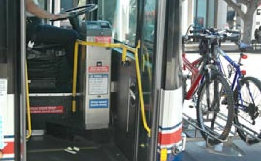 (Photo: Bus holding bikes at 3rd and Broadway Street, Josette Herdell/KPBS)
