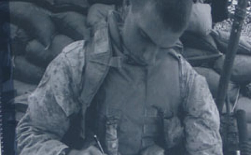 Afterwards, Corporal Reynaldo Leal stood by a framed photo he took of his sergeant. In the photo, Kirk is wearing desert fatigues and a flack jacket. His rifle is by his side. But in his lap is a notebook - and in his hand, a pencil he's using to draw.