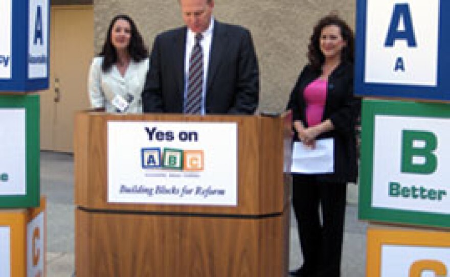 (Photo: Council member Kevin Faulconer announces Propositions A, B, and C, joined by Lani Lutar of the Taxpayers Association [left] and Lorena Gonzales of the Labor Council [right]. Alison St John/KPBS. ) A campaign has begun to pass three propositions on the June ballot that will affect future reforms at the city of San Diego. KPBS reporter Alison St John introduces us to Propositions A, B, and C.