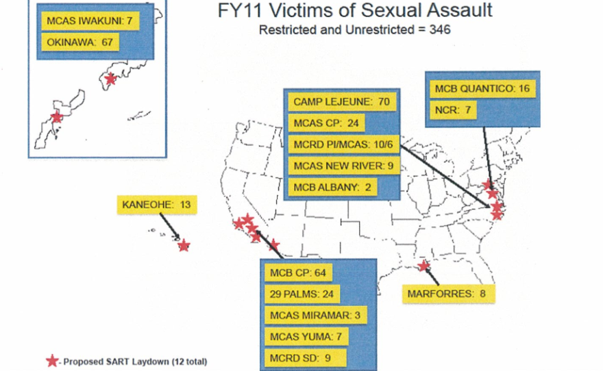 According to the report, between October 1, 2010 and September 31, 2011, a total of 88 assaults were reported at Camp Pendleton with a total of 64 victims. There were three assaults at MCAS Miramar, and nine at MCRD San Diego.