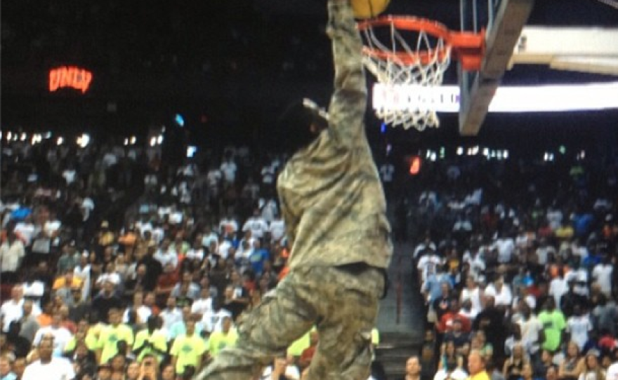 During a timeout, Airman Nathaniel Mills wowed the crowd with a full windmill dunk, wearing combat boots to boot!