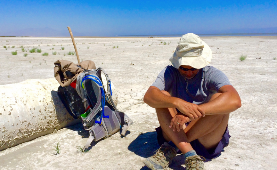 Trekking around the desert in Imperial County in June is not exactly a dream vacation but it was the realization of a personal goal for my next guests. What started out as a hiking trip became an environmental issue in because the hike was around California's largest lake. The imperiled Salton Sea . Randy Brown completed this hike last weekend and it's a central feature of a document produced about Sultan see. -- Salton Sea . Welcome to the show Randy. Like Alexander is here he's producing a document about the Salton Sea called abandoning paradise . Michael Cohen is a senior associate with the Pacific Institute. A nonprofit research organization on the Sultan see -- Salton Sea It's been a couple of days and I think I'm almost to normal recovering. I feel are fine and I'm feeling pretty good. You're the first person to hike around the shoreline? Yes. This walked did not start out as an environmental journey. Tell us how this idea came about? About a year ago it was a challenge for myself personally. I was overweight and I have started walking to try and lose weight in the hills above my home in Rancho Cucamonga. Is looking for a way to challenge myself. I enjoyed walking in the heat where live, and I went back to the days of camping as a child at the Sultan see. But it was an interesting place they wonder if anybody has ever walked around I thought it would be a challenge in the summertime. I researched it found that nobody had walked the shoreline. So I thought I'm going to do this. As I started planning about 14 months of planning, I started meeting people who lived there and learning more about the Sultan seat and the state it was in. It slowly turned into more of a challenge to range awareness. You had a rude awakening because your memories were from 35 years ago. But as you see today? Going back after that amount of time was shocking. It used to be a place, crowded that -- crowded campgrounds boats and fishing. It's now desolate. The water line had receded hundreds of yards from where account as a child. It was a real shock to see how it has changed and gone downhill. Michael you done reports on the Sultan see. If you could give us a reminder on how this see, this accidental man-made creation, how is it turned into this environmental wasteland? It's essentially the arm of the Colorado River Delta. The currents on this is fed or maintained by agricultural runoff it's somewhat artificial. Just another incarnation of leaks that have existed therefore eons. The main distinction is that the birds don't distinguish at all. It's very important ecological resource. Through a series of agreements, the most importantly the one at 2003, somewhat of it currently flows into the Sultan see is being transferred to San Diego. About 25% of San Diego's water now comes from the Imperial Valley . so the sea is shrinking? Is shrinking because of less water from Mexico and other factors. But what we will see in a few years is a very traumatic change. Randy mentioned there's been changes to the Sultan see and most of that has occurred in the last 15 years. But in about 3 years were going to see a bigger change in the Salton Sea . There's going to be a massive loss of fish and birds will go elsewhere. There's going to be a lot of dust in the area. You followed Randy on his hike around the Salton Sea. For you planning to do a document on this before two it was something that always interested me because my family came to Palm Springs in 2003 and we decided to drive down to see this inland sea. We had this fascination with this body of water and did not know much about it. It became this fascination and fast-forward to last spring I was looking for a new project and I was looking for something to do with the Sultan see. Granted started following me on twitter. His blog was called Salton Sea walk. We have an interesting subject matter with this guy and his attorney. So we could combined these 2 into one it was perfect. Tell us what your cameras recorded. I've seen some of the footage in your promotional trailer. Sections of the Salton Sea to not look like a wasteland they look really beautiful. That was one thing we wanted to capture. Is not just a wasteland we wanted to give a fairly objective look. There are places that are extremely rundown and were not going to hide that, but we did capture gorgeous shots of sunsets and sunrises. We had a drone that we flew all over the coastline. It's stunning and if we can get people to at least get some interest, to at least look at out. To Google the Salton Sea, I think we've done our job. At the mileage of the track itself, 116 miles, it sounds like a lot. Is not a record-breaking hike but you had to deal with some very terrible conditions. Tell us about that. A 100 mile hike is not all that big of a deal but a 100 mile hike in the summer at the Salton Sea is a big deal. Temperatures ranged from about 90 degrees to 100 and 90 degrees to 108 degrees and I was expecting temperatures up to 120. We did not get that high. Combined with that you have humidity of 95% or more works like a wet hot blanket on you. So it is hard to stay cool. You've got to send along the shore. I used to call it my but it's more like quicksand. If you get stuck in there alone, you're in big trouble. In addition to that a lot of the shore is covered with dead particle shells and fish bones. A couple of feet deep, walking through that is like trudging through the snow like climbing up stairmaster for hours at a time in this heat. It's very challenging and that's not mentioning rivers and water drainage canals to cross. The horse flies are relentless. They were biting me through the shirt on my back. So it was a challenge. Don't try this at home or at the Salton Sea unless you have to [ laughter ]. We spoke to last fall about this report in this urged lawmakers to come up with a plan to rehabilitate the sea risk an environmental disaster. Can you give us the short version of why this is a potential