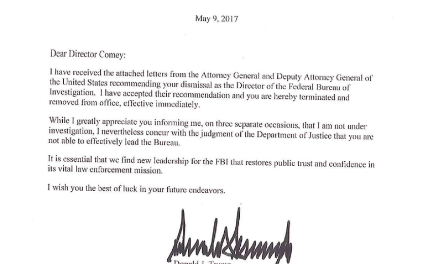 In his brief letter Tuesday to Comey, Trump said the firing was necessary to restore "public trust and confidence" in the FBI. The administration paired the letter with a scathing review by Rosenstein, the recently confirmed deputy attorney general, of how Comey handled the investigation into Clinton's email practices, including his decision to hold a news conference announcing its findings and releasing "derogatory information" about Clinton.