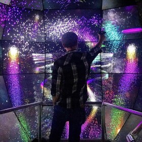 On my visit to the cave, a bright digital art piece bounced countless colorful pixels, while transcendent music played overhead. The whole structure, with its 70 4K resolution screens, is powered by 35 computers.