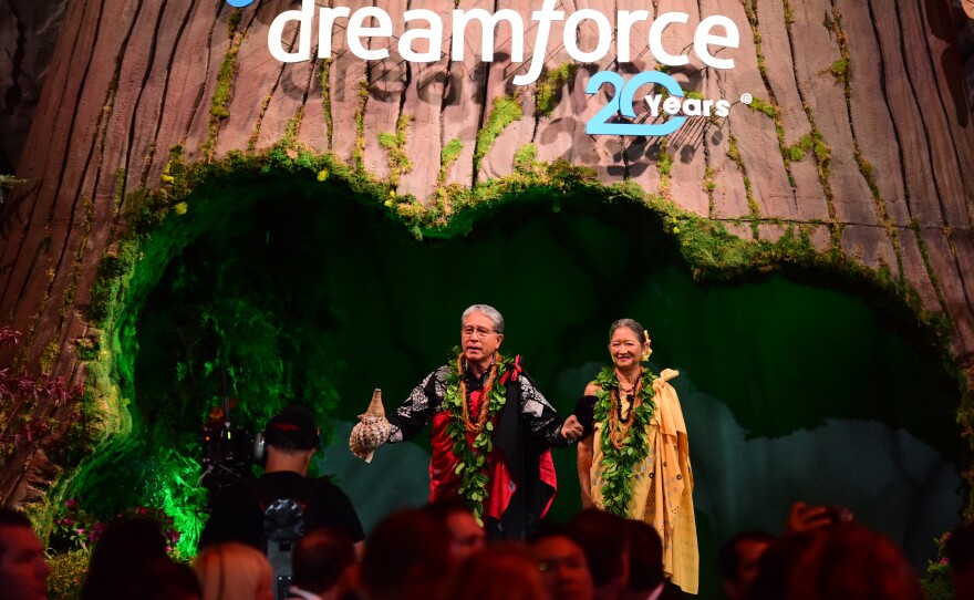 Danny Akaka Jr. and Anna Akaka address attendees during Salesforce's 2022 Dreamforce conference in San Francisco. Danny, the son of late U.S. Sen. Daniel Akaka, and Anna have been spiritual advisers to Benioff.