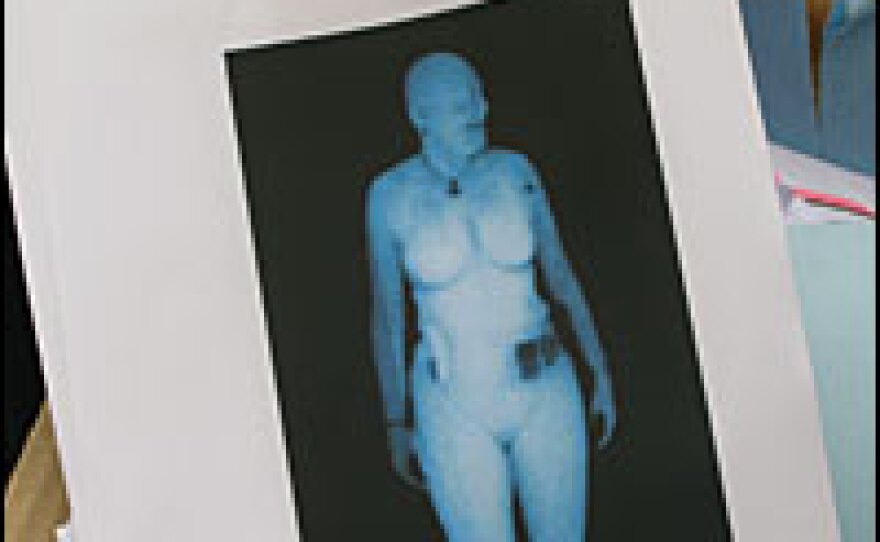 It was the scan that Jaberi particularly objected to, because, she said, guards are essentially able to see a woman naked as she stands in the scanning booth. The picture she displayed actually looks like a naked female alien, blue-tinted and bald, because the scanner doesn't see hair or clothing. What it sees is the body itself, plus the dark outline of any jewelry or, presumably, any concealed weapon.
