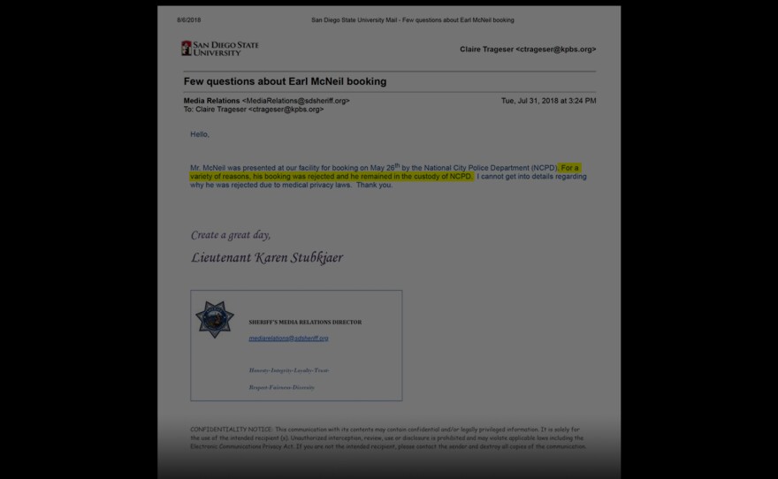 KPBS has requested the footage of McNeil when he arrived for booking, but has not yet been provided the information.