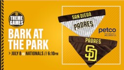 Join the Padres for Bark at the Park on July 8! Bark at the Park gives you the chance to sit with your favorite canine while enjoying a Padres game! Your Theme Game Package includes a limited-edition pet bandana and a ticket to the Nationals vs. Padres game. All tickets for this event will give you and your dog access to the Bark at the Park area in Gallagher Square. Please submit your dog’s current vaccination records (Rabies, Bordetella and DHPP) and complete/signed waiver to bark@padres.com. Applications will not be considered unless both the vaccination records and signed waiver are attached to the email. After your application is approved, you will be sent a special access code. Please note: Each dog must be accompanied by at least one human. Fans with two or more dogs must have one human per dog. Dogs must always remain on a leash.