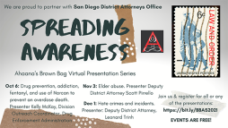 Ahaana's Brown Bag Virtual Presentation Series: October 6: Drug prevention, addiction, fentanyl, and use of Narcan to prevent an overdose death. Presenter Kelly McKay, Division Outreach Coordinator, Drug Enforcement Administration November 3: Elder abuse. Presenter Deputy District Attorney Scott Pirrello December 1: Hate crimes and incidents. Presenter: Deputy District Attorney, Leonard Trinh Ahaana is proud to partner with the San Diego District Attorney's Office. Free! RSVP required
