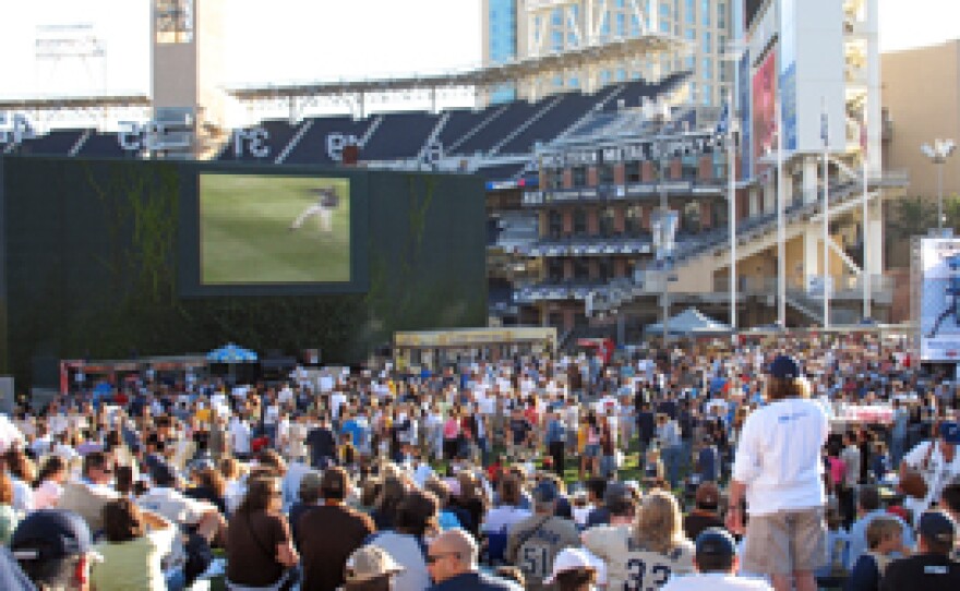 About 3,000 San Diego Padres fans gathered at Petco Park Monday for a special afternoon pep rally. The Padres kick-off their National League Division series against the St. Louis Cardinals today. KPBS Reporter Ana Tintocalis has more.
