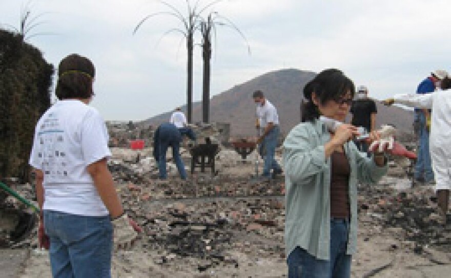(Photo: Neighbors search through the rubble of their burned out houses on Lancashire Way in Rancho Bernardo. Rene Gutel/KJZZ )