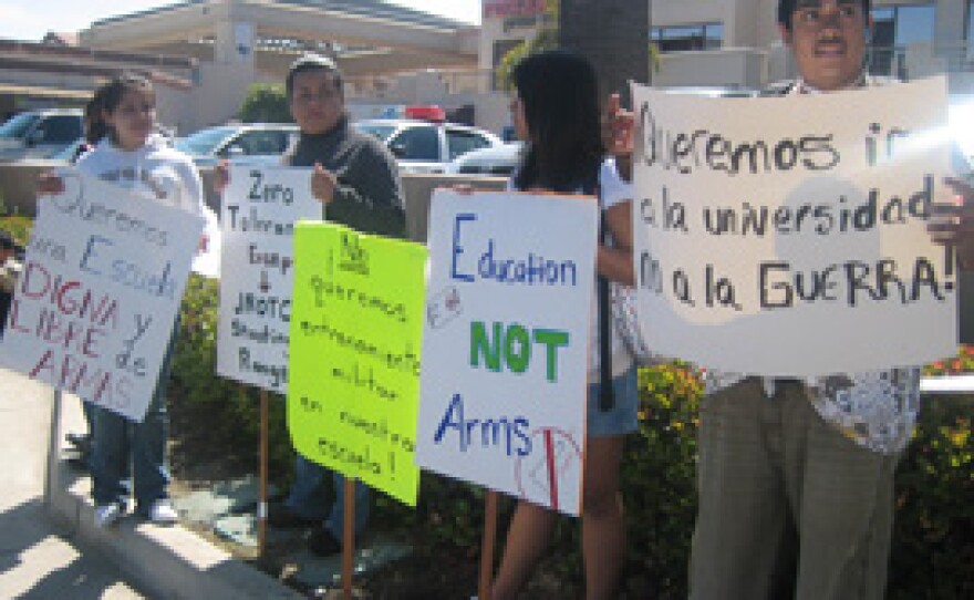 About 20 Mission Bay High School students walked out of school today to protest a Junior ROTC program on campus. KPBS Reporter Ana Tintocalis has more.