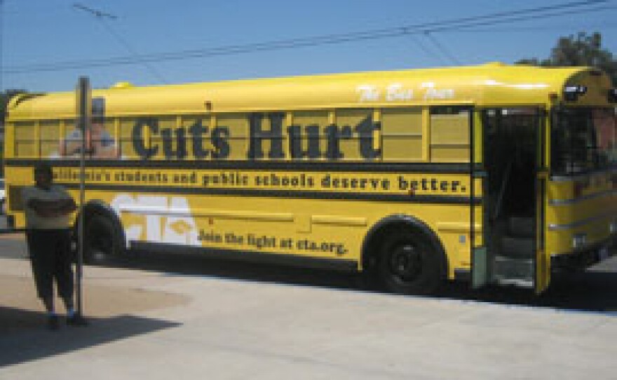 California teacher's union leaders rolled in San Diego today on a school bus to speak out against cuts to state education funding. KPBS Reporter Ana Tintocalis has more.