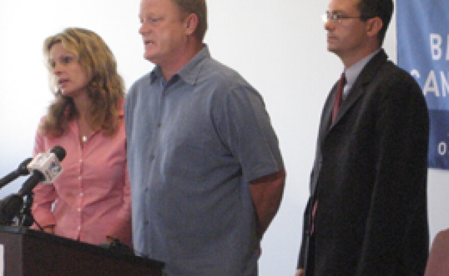 (Photo: William and Julie Hillstead, whose son committed suicide after a police stand off - with Kevin Keenan, Executive Director of the ACLU. Alison St John/KPBS )