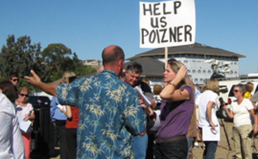 (Photo: A group of families who lost their homes in last year’s fires but have still not reached a settlement with their insurance companies. They ‘re calling on California Insurance Commissioner Steve Poizner to push for legislation to reduce the problem of underinsurance. Alison St John/KPBS )