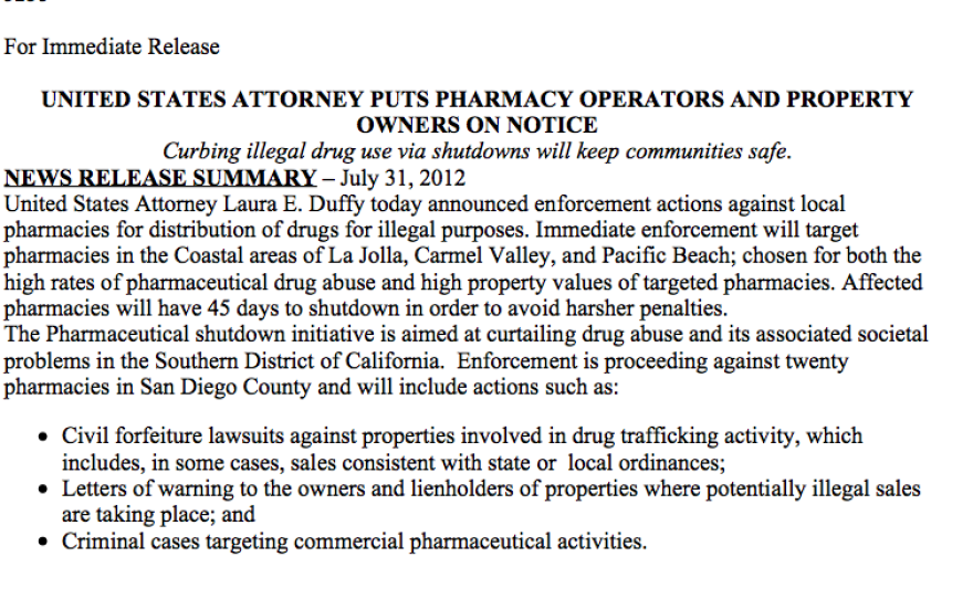 "United States Attorney Laura E. Duffy today announced enforcement actions against local pharmacies for distribution of drugs for illegal purposes," the fake release read. "Immediate enforcement will target pharmacies in the Coastal areas of La Jolla, Carmel Valley, and Pacific Beach; chosen for both the high rates of pharmaceutical drug abuse and high property values of targeted pharmacies. Affected pharmacies will have 45 days to shutdown in order to avoid harsher penalties."