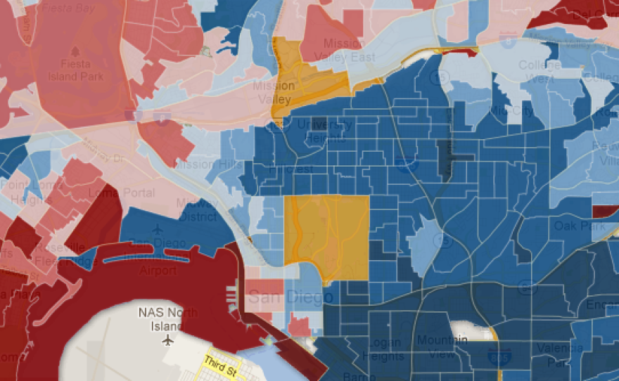 The shading of the precincts is based on the margin by which a candidate won that precinct. The darker the color, the wider the margin. These results are unofficial, and we will update the map as the San Diego County Registrar of Voters releases new information.