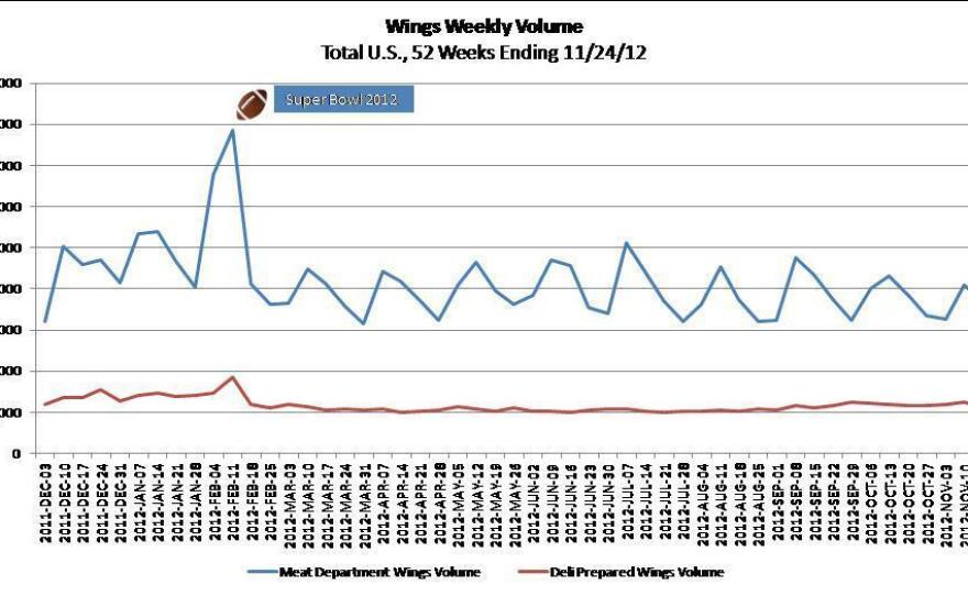 Nope. Click on the blue box in the lower right-hand corner and you'll see that the blue line tracks the number of chicken wings that Americans bought at grocery stores over the last year. See that mighty surge of wing-buying in early February? Apparently, you just cannot have a Super Bowl party without chicken wings -- millions and millions of chicken wings.