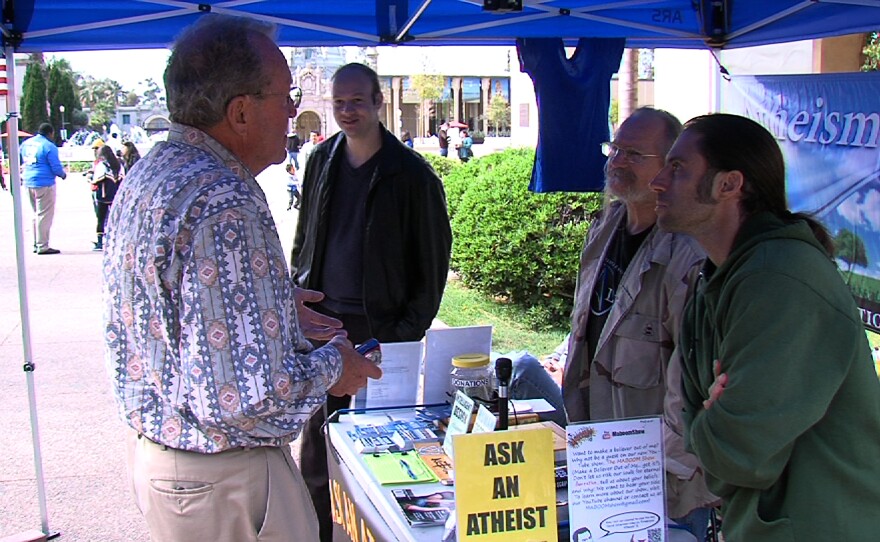 The booth isn't the only outreach the atheists are doing. They recently had their first Sunday Assembly, which was actually held on a Saturday. The atheist church service had singing, games and a scientific lecture from UC San Diego dark matter researcher Kim Greist.