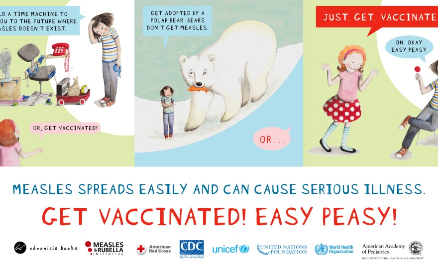 "I've long wanted to join these two worlds, the work I've done for measles and my main life, which is in the children's book world," Blackall, an Australian who lives in Brooklyn, N.Y., told Shots. So she asked her publisher, Chronicle Books, if Ivy and Bean could enlist. She got an enthusiastic yes.