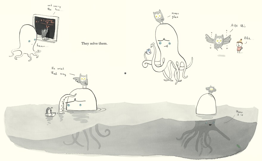Alongside those words, Jeffers' illustrations show the owl and octopus solving mathematical equations, teaching a boy to fly and gluing Cup back together: