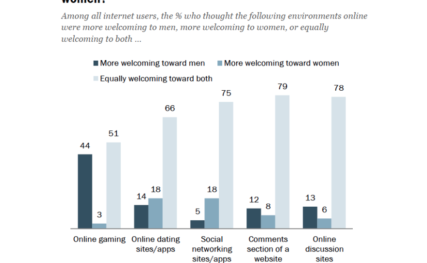 The Pew research supports the notion that women are less welcome in the world of online gaming. Survey respondents were asked about a series of online platforms — social networks and online commenting forums, for example — and whether they thought those platforms were more welcoming to women, equally welcome to both sexes or more welcoming toward men.