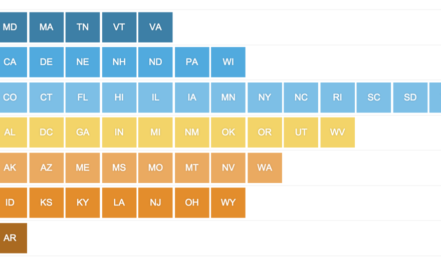 Maryland, Massachusetts, Tennessee, Vermont and Virginia did the best, scoring eight out of 10, while Arkansas, Idaho, Kansas, Kentucky, Louisiana, New Jersey, Ohio and Wyoming scored at or near the bottom.