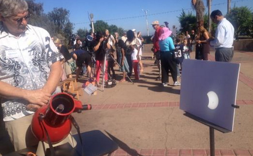 People turned out at the Reuben H. Fleet Science Center in Balboa Park to see the eclipse. Fleet staff were on hand to answer questions about the lunar event.