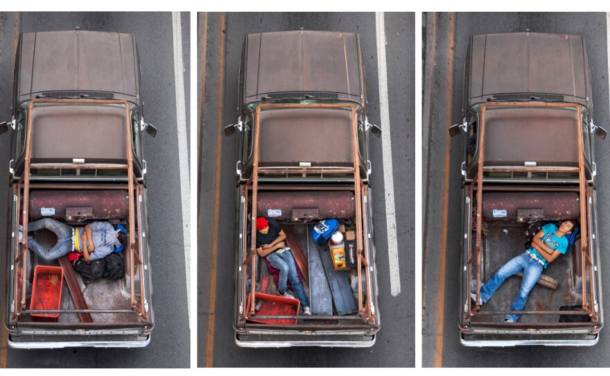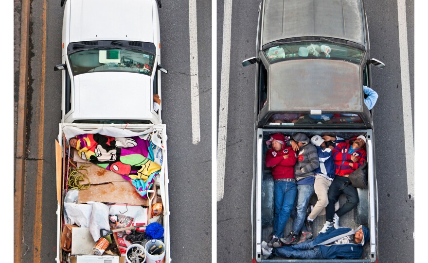Alejandro Cartagena does not know much about the lives of these "Carpoolers," whom he photographed for a year starting in the winter of 2011, heading down Highway 85 off Monterrey. But he does know this: Every morning from about 7 to 9 a.m., groups of construction workers gather by a "maestro" (or head construction worker) before they hit the highway and head south toward San Pedro. They lay low in the truck's beds, surrounded by the tools of their trade, along with blankets and towels to make the ride more comfortable. The commute runs from 45 to 90 minutes, depending on traffic.