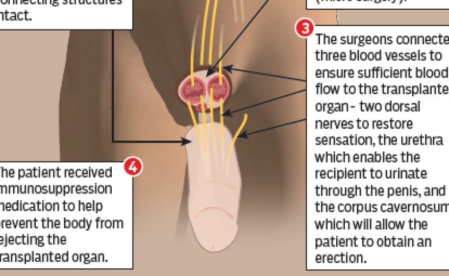 The December operation used microsurgery techniques to precisely align the blood vessels, nerves, urethra and tissues — particularly the corpus cavernosum tissue that enables erections — between the recipient's stump and the harvested penis. One issue that prolonged the surgery, van der Merwe says, was the discovery of how much scar tissue there was on the stump. To work around it, the team rerouted an abdominal artery to the organ.