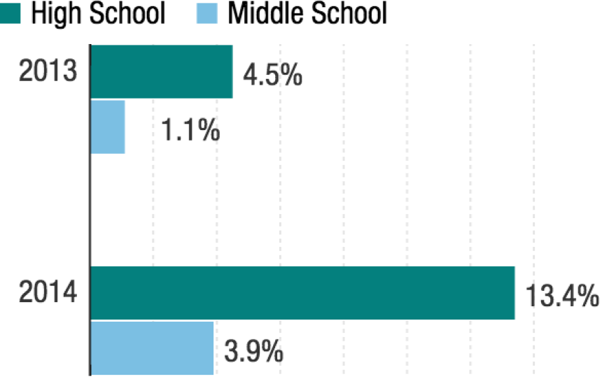 The statistical findings, published in this week's issue of Morbidity and Mortality Weekly Report, come from the CDC's National Youth Tobacco Survey. The latest survey found that the use of e-cigarettes increased from 1.1 percent in 2013 to 3.9 percent in 2014 among middle school students, and from 4.5 percent to 13.4 percent among high school students. That translates to a total of 450,000 middle school students now using e-cigs, alongside 2 million high school students