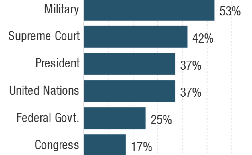 Millennials are distrustful of institutions like Congress and the federal government — only 17 percent and 25 percent, respectively, say they trust those entities. But the numbers are higher for the military (53 percent) and Supreme Court (42 percent). Overall, they are less trusting of major federal and international institutions than they were five years ago.