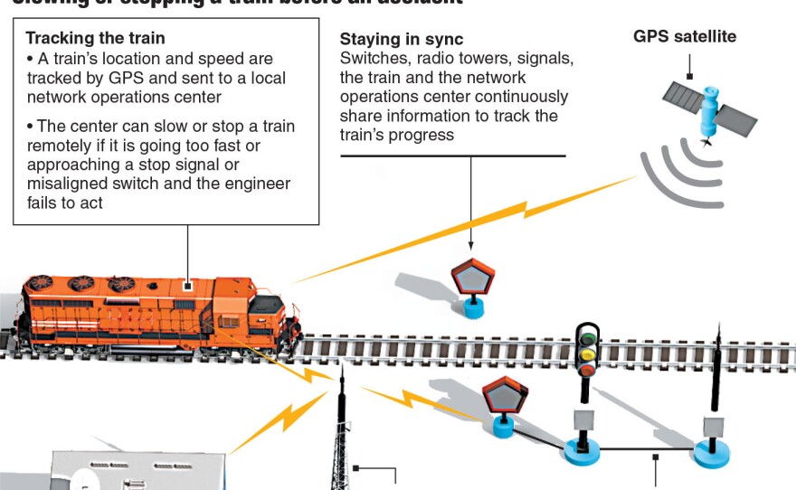 Mandated by Congress after a head-on 2008 crash in Southern California killed 25, the system recognizes when signals turn red and where speed limits drop, and automatically will slow down or stop the train if the engineer misses a signal or goes over the speed limit.