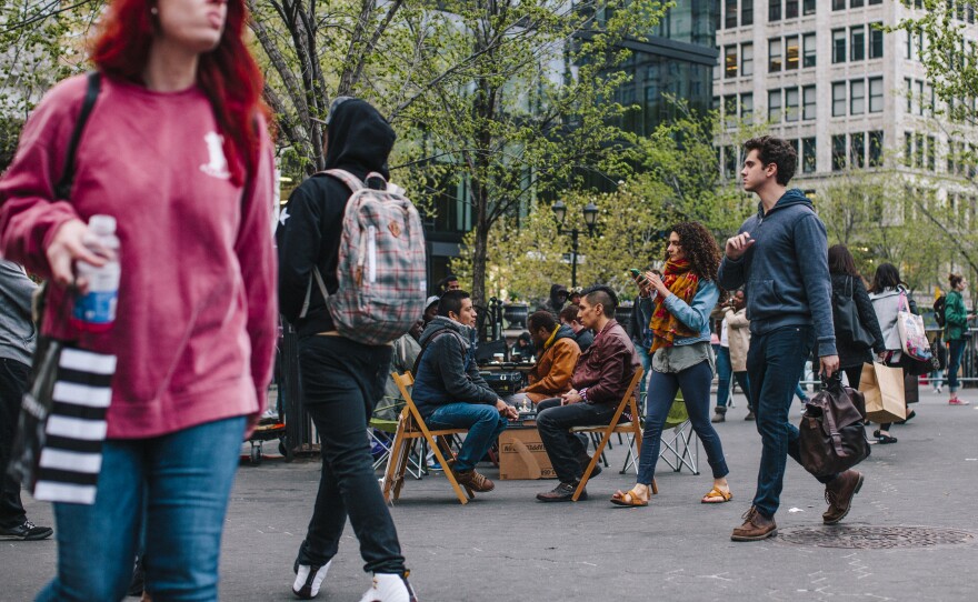 On a gusty Friday evening in Manhattan's Union Square Park, Francisco Ramirez is setting up his chairs and a big sign that yells, "FREE ADVICE."