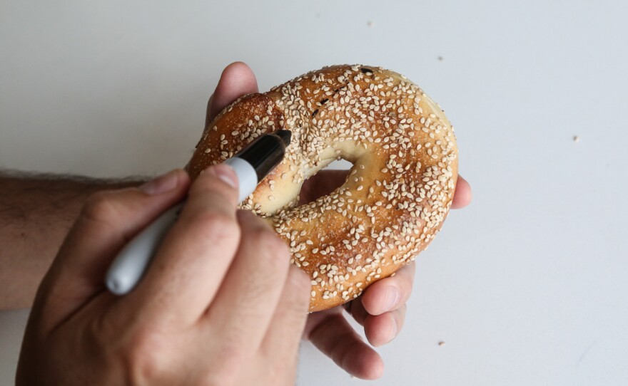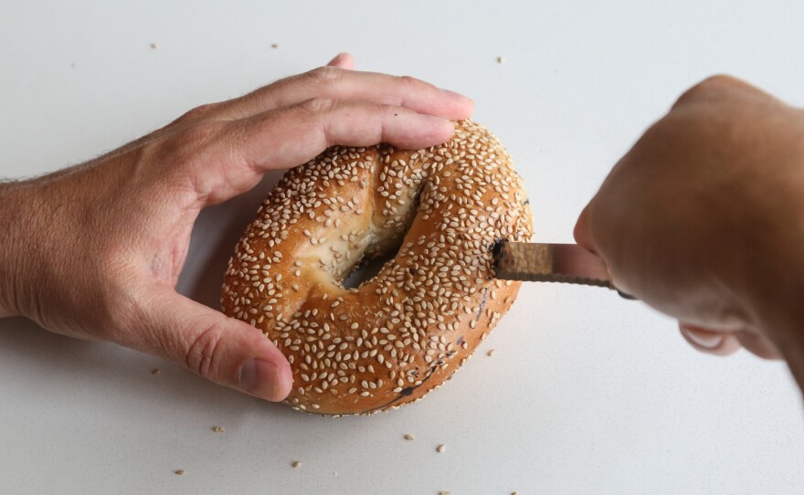 The line needs to wrap around the outside and inside of the bagel, and end up connecting to the beginning. Then slice along the line using a small, nimble knife.