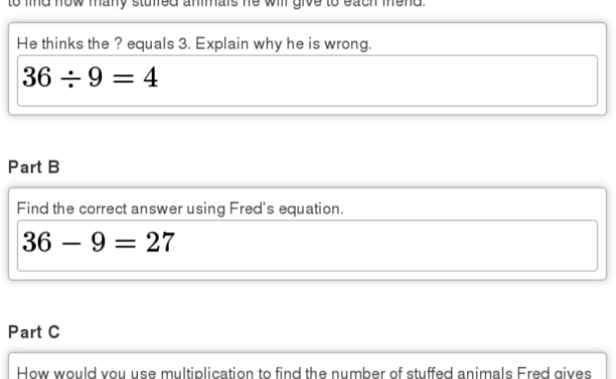 While we're on the subject of text, Briars and Burkhardt both noted the language of this question. Briars says a lot of thought goes into making sure the words and context are age-appropriate. PARCC doesn't want a third-grader who understands the math to get hung up on a sentence she can't read or understand easily. In this case, the subject is certainly accessible — stuffed animals — though Burkhardt believes the language could be even simpler.