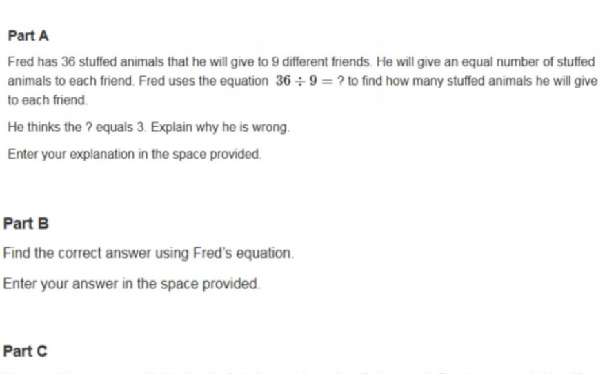 This question's three parts require the test-taker to (in parts A & B) demonstrate facility with division to prove the test-taker's answer is incorrect and (part C) convert the problem from division to multiplication. Briars says understanding the relationship between division and multiplication — and using one to explore the other — are key mathematical skills.
