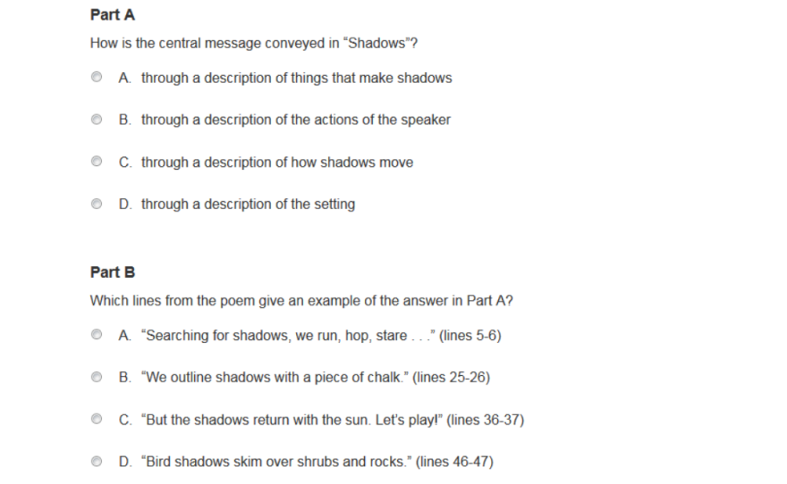 PARCC has highlighted these types of questions as a way to get students to think more deeply. The above question, for example, isn't just asking you what the main idea is, it's asking how the poem shows you that idea and then it asks you to prove it.