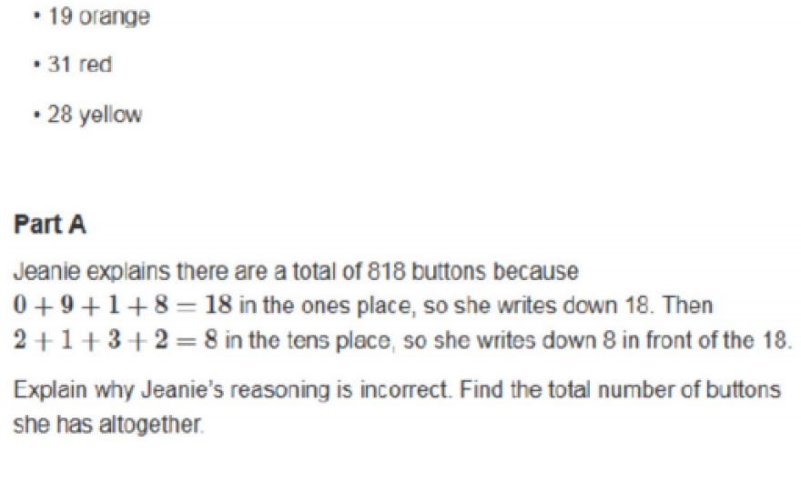 As with the question about Fred and his stuffed animals, the subject matter here is certainly accessible: buttons. Another similarity: It presents test-takers with another incorrect answer. This one's a bit more complex, though, because Jeanie's faulty reasoning is more complex.
