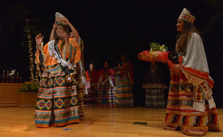 Twelve young women in their teens and early twenties are walking on a stage surrounded by twinkling lights that look like a starry night sky, wearing eye-catching dresses of Seminole Indian patchwork. They're contestants in the 58th annual Miss Florida Seminole Princess Pageant. The winner will be the tribe's ambassador to the wider world.