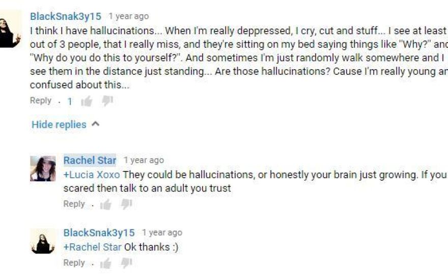 Still, she cautions others to think carefully before coming out to the world about their mental illness. It can be dangerous, she admits. She says she gets phone stalkers and death threats. But she is still glad that she did it. It's uncomfortable for her to think what might have happened if she never went online about her depression and schizophrenia. "I see myself being a lot more closed off," she says. "I hope I would have found other people's videos."