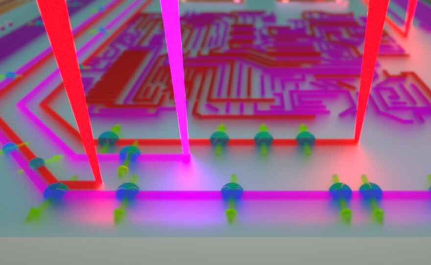 The bulbs happened to emit the exact wavelength of light that could polarize the strontium titanate and influence their new material's electrical properties. With a little tweaking, they were able to use this wavelength to gently and rapidly "paint" electrical junctions on the fragile material. Shine light of a second specific wavelength, and the circuits were erased. What amounts to an optical Etch A Sketch could someday help scientists build quantum computers.