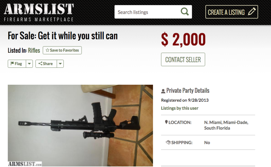 These classified advertisements for semi-automatic weapons were listed this week on Armslist, a website where anyone can advertise a firearm they'd like to sell, and anyone can contact a seller with an offer to buy. The site is legal. But there's no way to know whether buyers and sellers who meet through Armslist are following federal, state or local background check rules.