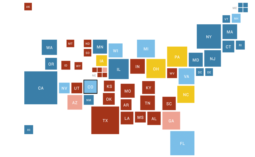 Safe D (164): California (55), Connecticut (7), Delaware (3), Hawaii (4), Illinois (20), Maine* (3), Maryland (10), Massachusetts (11), New York (29), Rhode Island (4), Vermont (3), Washington, D.C. (3), Washington state (12)Likely D (37): Maine (1), Minnesota (10), New Jersey (14), New Mexico (5), Oregon (7)Lean D (87): Colorado (9), Florida (29), Michigan (16), Nevada (6), New Hampshire (4), Virginia (13), Wisconsin (10)Pure Tossup (59): Iowa (6), North Carolina (15), Ohio (18), Pennsylvania (20)Lean R (28): Arizona (11), Georgia (16), Nebraska* (1)Likely R (27): Indiana (11), Missouri (10), Utah (6)Safe R (136): Alabama (9), Alaska (3), Arkansas (8), Idaho (4), Kansas (6), Kentucky (8), Louisiana (8), Mississippi (6), Montana (3), Nebraska (5), North Dakota (3), Oklahoma (7), South Carolina (9), South Dakota (3), Tennessee (11), Texas (38), West Virginia (5), Wyoming (3)