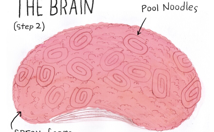 Today, the students are running around the science room collecting their puppet monsters. They're finally ready to attach them to the giant pink brain, a massive foam and wire structure that looks like a 2-ton jellybean.
