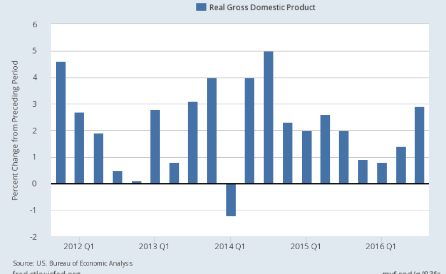 The Commerce Department said the economy grew by 2.9 percent in this year's third quarter. That's a very solid expansion — the fastest pace in two years. It exceeded the 2.5 percent rate most economists had been forecasting.