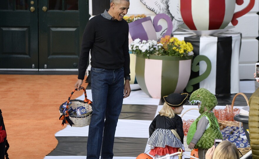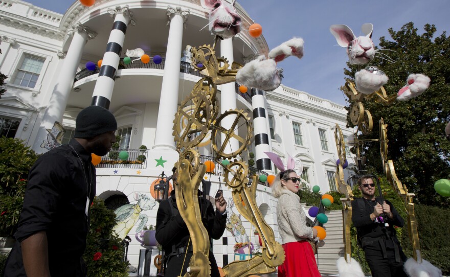 President Obama and first lady Michelle Obama welcomed Washington-area children and children of military families to trick-or-treat at the White House Monday night. The outside was decorated in an Alice in Wonderland theme, complete with giant teacups and rabbits.