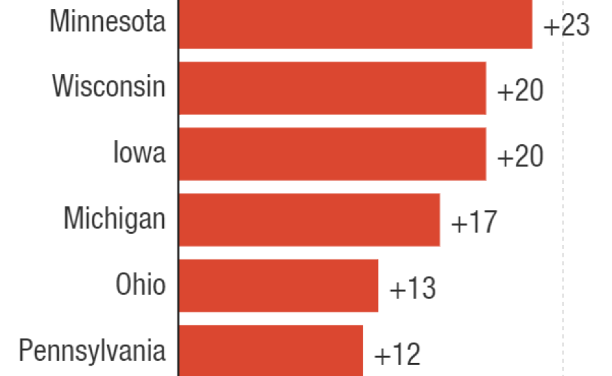 Ohio and Iowa went by huge margins for Trump –- almost 10 points in Iowa and 9 in Ohio. Trump won Wisconsin and Pennsylvania (by less than a point), leads in Michigan (by an even smaller margin), and lost by less than 2 points in Minnesota.